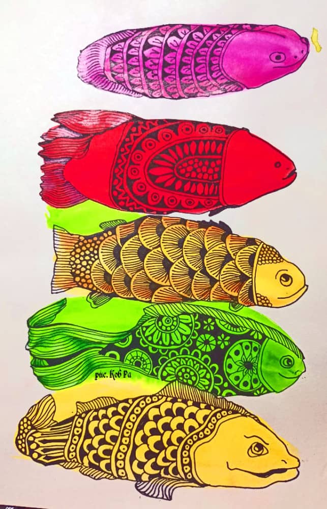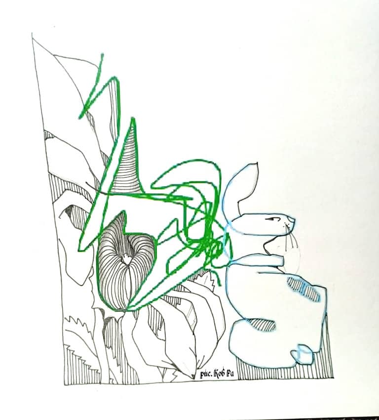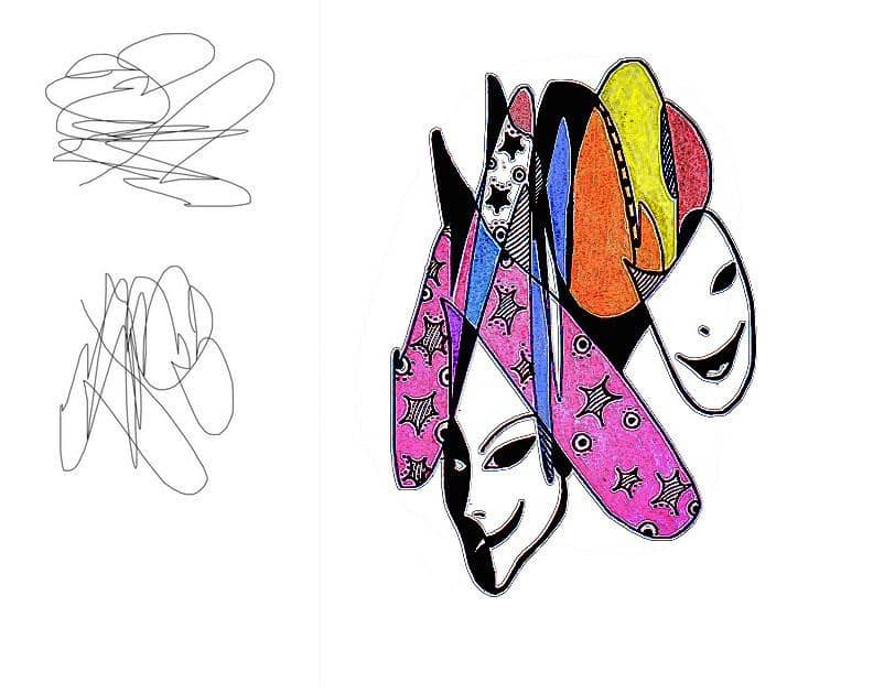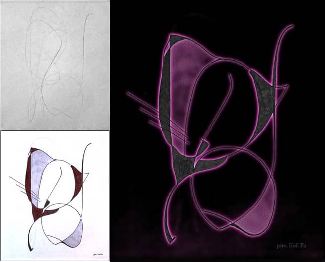 Эта игра называется "монотипия" или "почеркушки". Она подходит абсолютно для всех: детей и взрослых, нехудожников и художников. Развивает воображение, творческие способности, ставит руку, поднимает настроение, в конце концов, это просто интересно. Играть можно одному и в компании. Достаточно любой капли случайно пролившегося кофе, чая, сока, краски; достаточно любой почеркушки в стиле "каля-маля" и получается удивительная, уникальная работа, которую специально не придумаешь. На одном из литературных сайтов эта игра была предложена читателям. Народ откликнулся. Из присланных мне клякс и почеркушек получились крутые штуки.