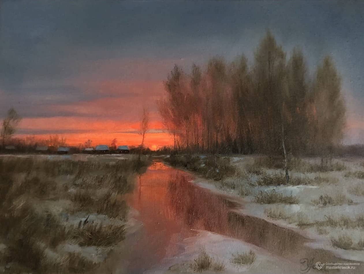 " Вечер. Мороз. Снег растопить попытался Тёплый закат..."