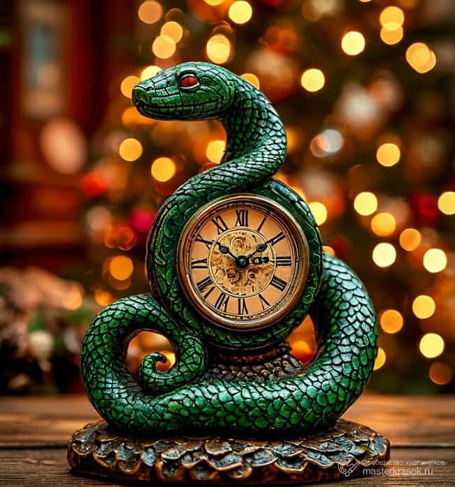 Зелёная деревянная змея вокруг часов, сзади новогодняя ёлка