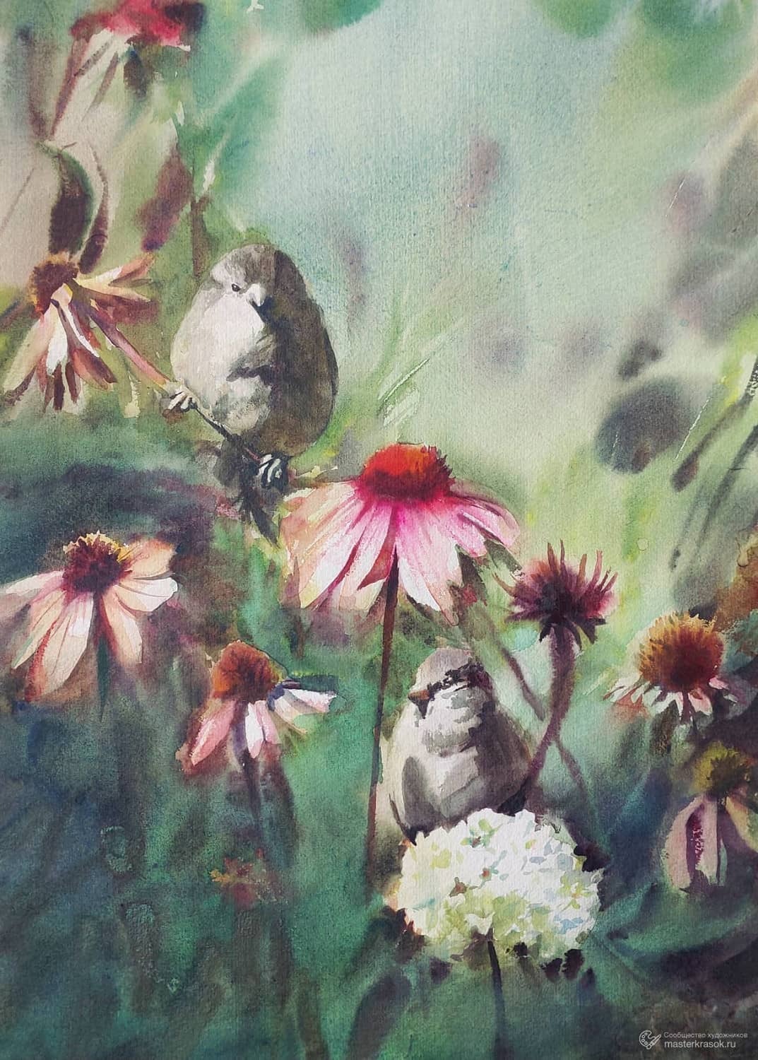 "Воробьи и эхинацея. На Манежной площади" Акварель