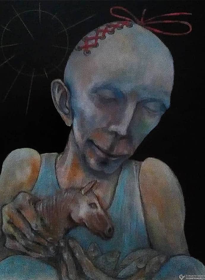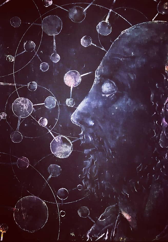 ... конец 20-ого — начало 21-ого вв.... гелевые ручки......за давностью создания , автор затрудняется вменяемо обьясненить концепцию данного Шедевра... скорее всего это зарисовка на тему "падение души в материю"... во всяком случае, слово "υλη" (на пелёнке, в которую закутано существо, находящееся в корзине), можно перевести с греческого именно как "материя"... но материя не в смысле "ситец-парча", а материя, как субстанциональная основа структуры реальности... 🎡... 2000