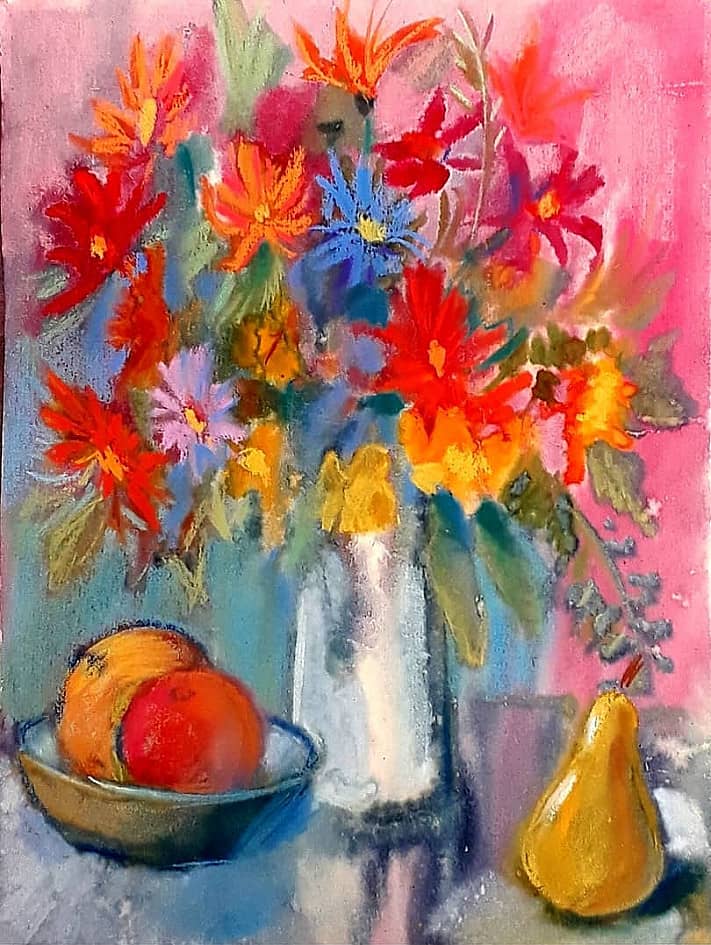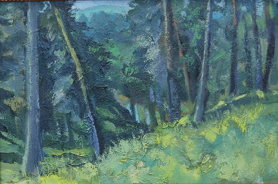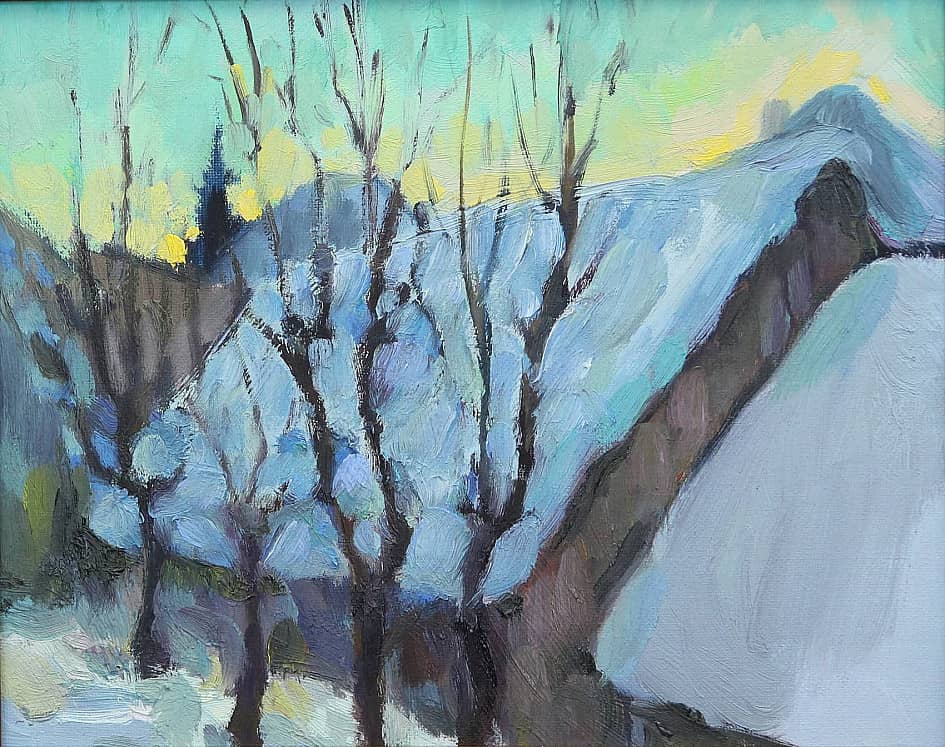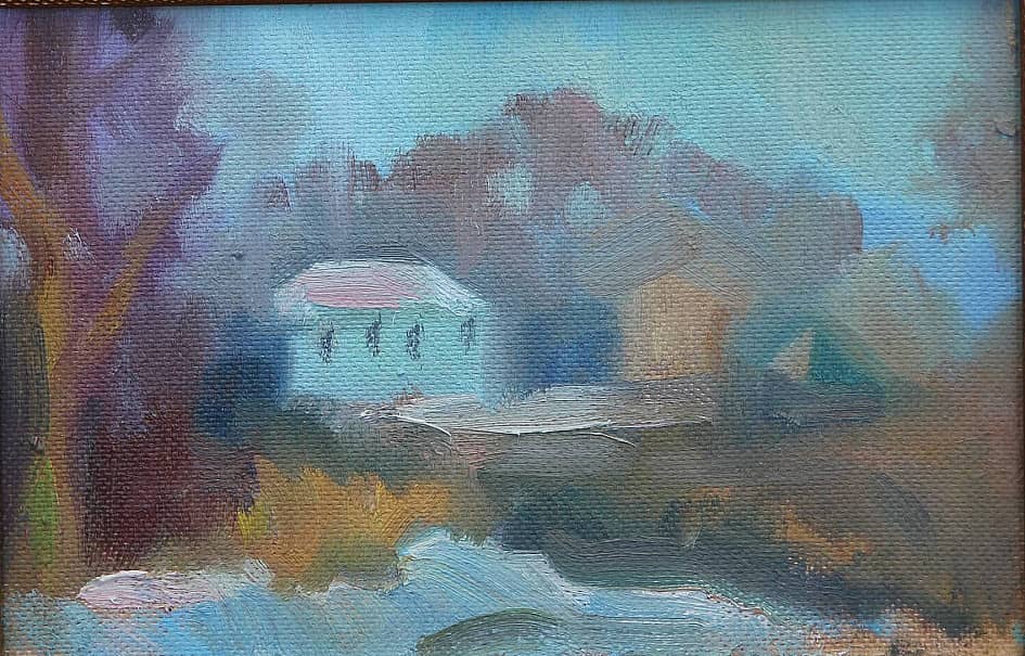 На самом деле, в то утро моей целью были туманы. Вдоволь ими насладившись, я побрёл домой по берегу вдоль пруда, как вдруг....Из-за спины скользнула красная стрела встающего солнца, освещая домики передо мной. Топлёное солнце отодвигало холодные тени, а освещенные фрагменты пейзажа "заярчились" неестественными красками. Я в восторге стал быстро раскладываться, боясь потерять момент. Хотя бы главное ухватить, остальное потом дотяну....едва-едва. Миг пролетел так же стремительно, как и начался.Прошло много лет. У нас намечалась юбилейная выставка...