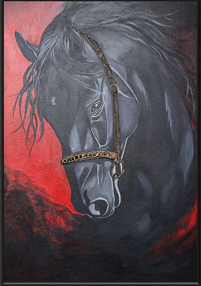 Взгляд сквозь пламя «Взгляд сквозь пламя» наполнена энергией огня и мощью благородного животного. Алый фон, глубокий чёрный силуэт, текстурные мазки — всё здесь говорит о страсти, решительности и независимости. 2026