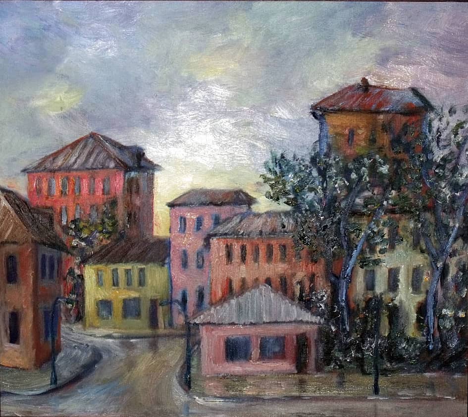 Как-то шёл по одной из центральных улиц города и (благо рост позволяет) заглянув через забор, увидел такое. Поразил контраст шумной суеты современного мегаполиса и тихой, нетронутой идилии из прошлых веков. Под рукой была камера, я это отснял и сделал по снимку две копии маслом. Друзья посмеивались, де мол, "курятники нарисовал".)) Одна копия отправилась в Чехию, а вторая висит у меня над рабочим столом. Теперь, этого дворика больше нет. 2002
