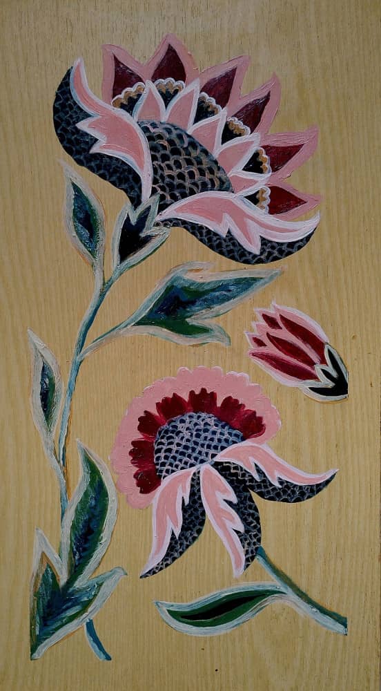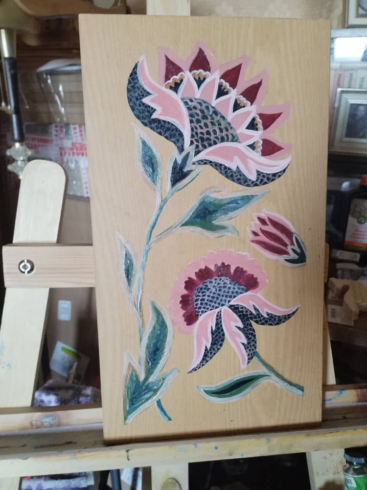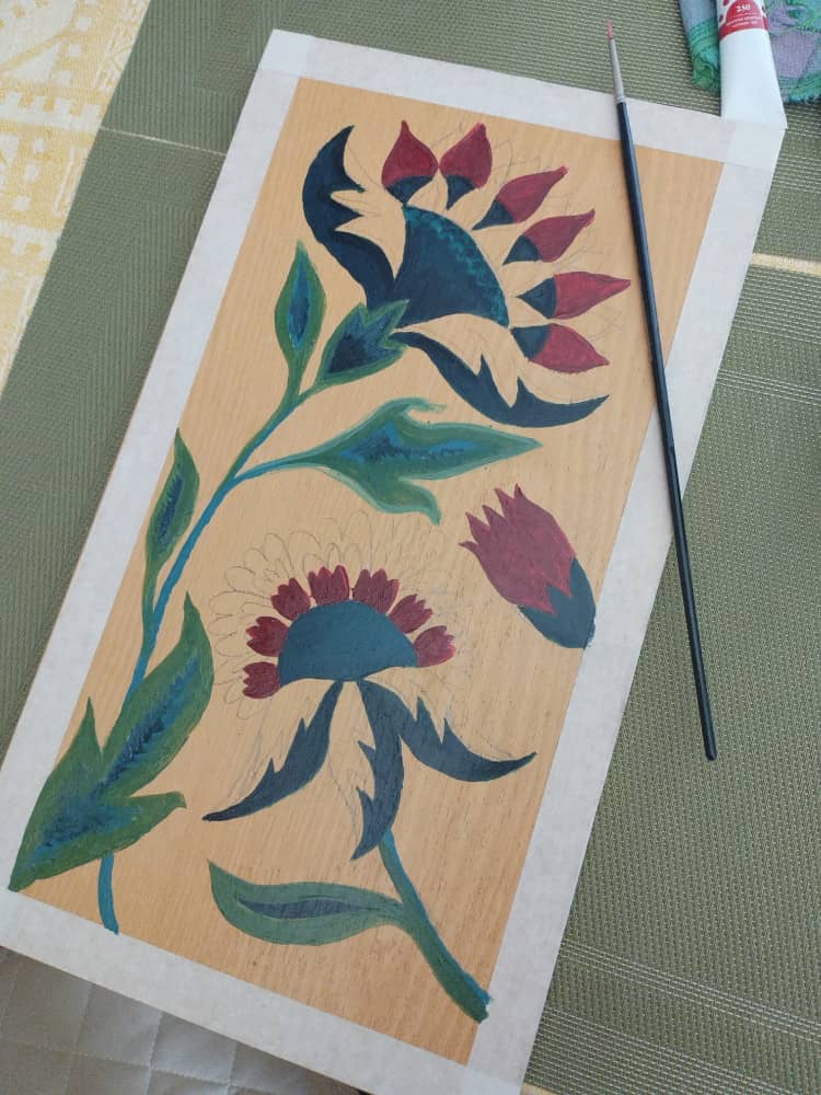 Ещё мне захотелось сделать роспись в гармоничных цветовых решениях, которые уже исторически отразились в самом покрывале. Правда, нужные оттенки надо было найти путём смешивания. Возможно, где-то не угадала, но стремилась приблизиться к аутентичному паттерну. В общем, будем считать, что это мой первый раз, а досочка получила вторую жизнь.