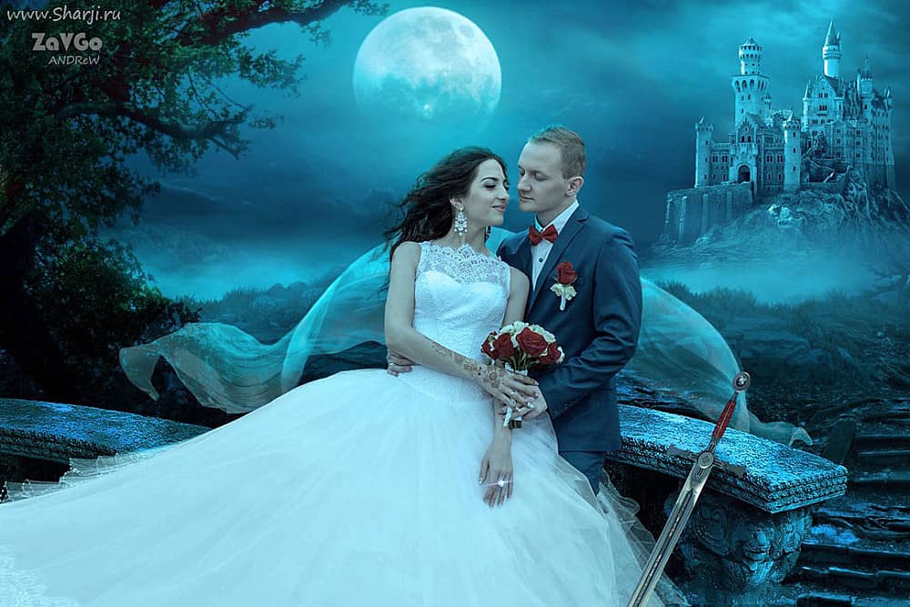 Вам хочется, чтобы ваши снимки были необычными и оригинальными. Каждая пара индивидуальна и неповторима. Кому-то подойдёт розовый рассвет, для других полная луна и звёзды. И только, как говорят: «подлецу всё к лицу». Надеюсь, моя тёща не читает эти строки... Свадебные фотоманипуляции Фотошоп отличаются от других? По секрету: «ничем», разве что на торжественную тему.