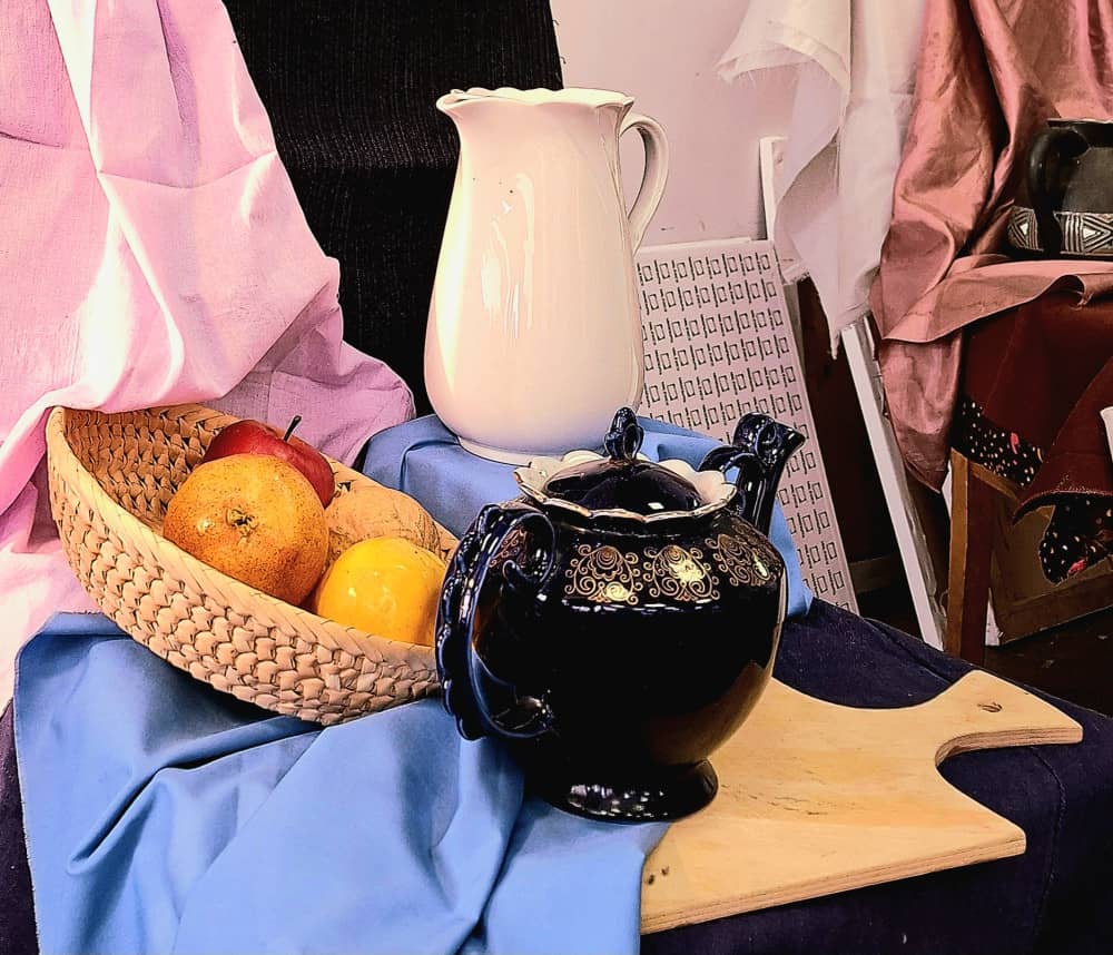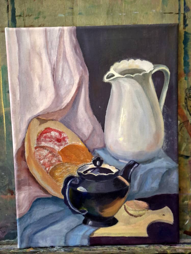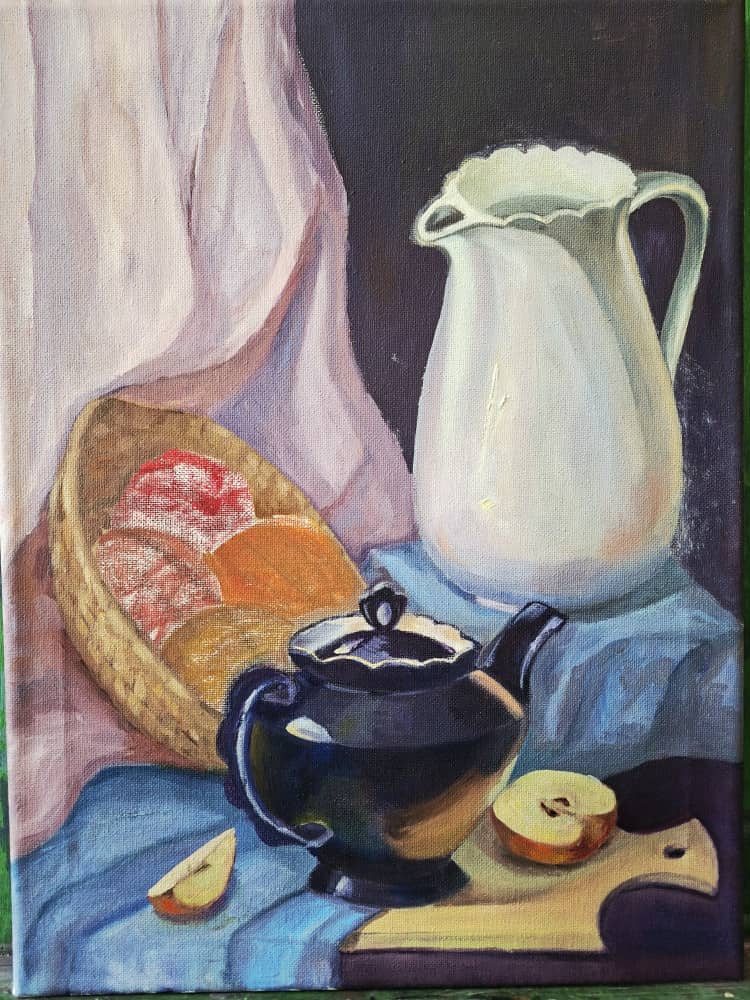 Делюсь своими впечатлениями от занятий живописью. Первое, чего я конечно не делала раньше, это тщательная проработка наброска карандашом, выверение пропорций, обьемов. Мой рисунок всегда был быстрым и примерным. Поэтому очень много потом делала переделок уже красками. Второе, это внимание к теням, оттенкам, бликам. Это еще предстоит научиться видеть. Через пару уроков думаю работу закончим, сейчас фото в работе и оригинал. Ваши замечания приветствуются.