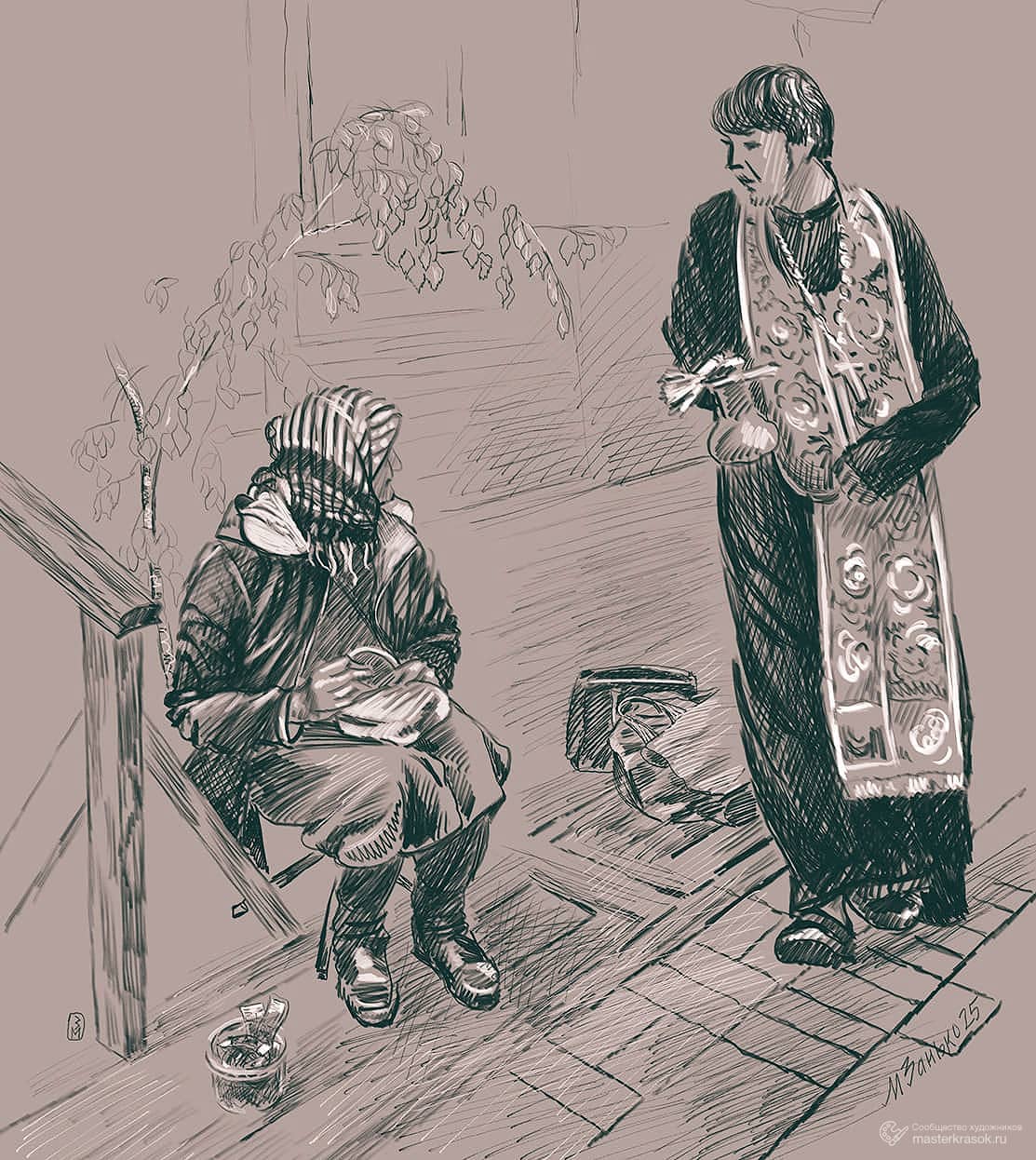 У входа в храм (уличная сценка). Нищенка и батюшка.