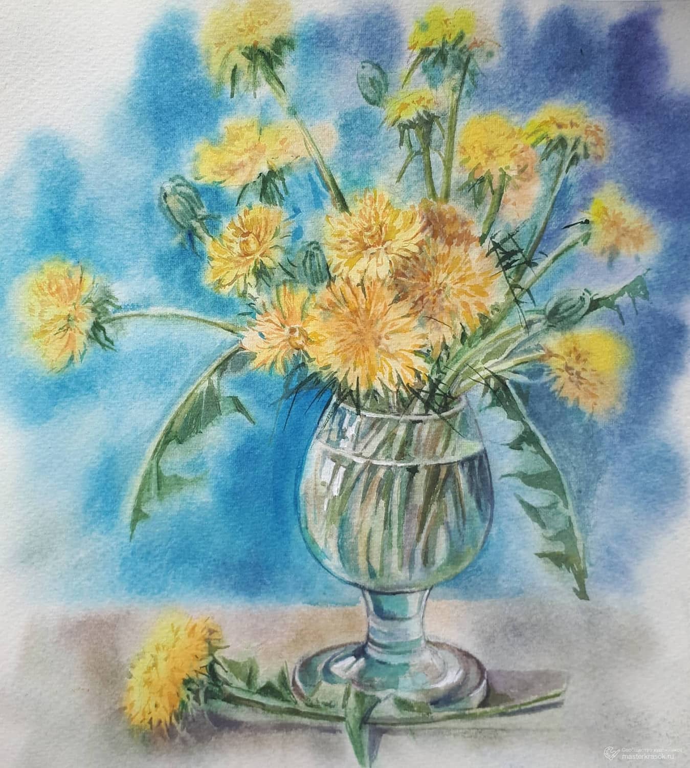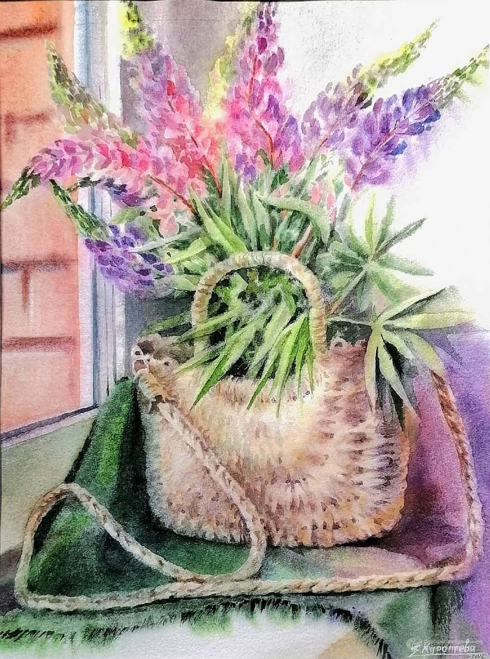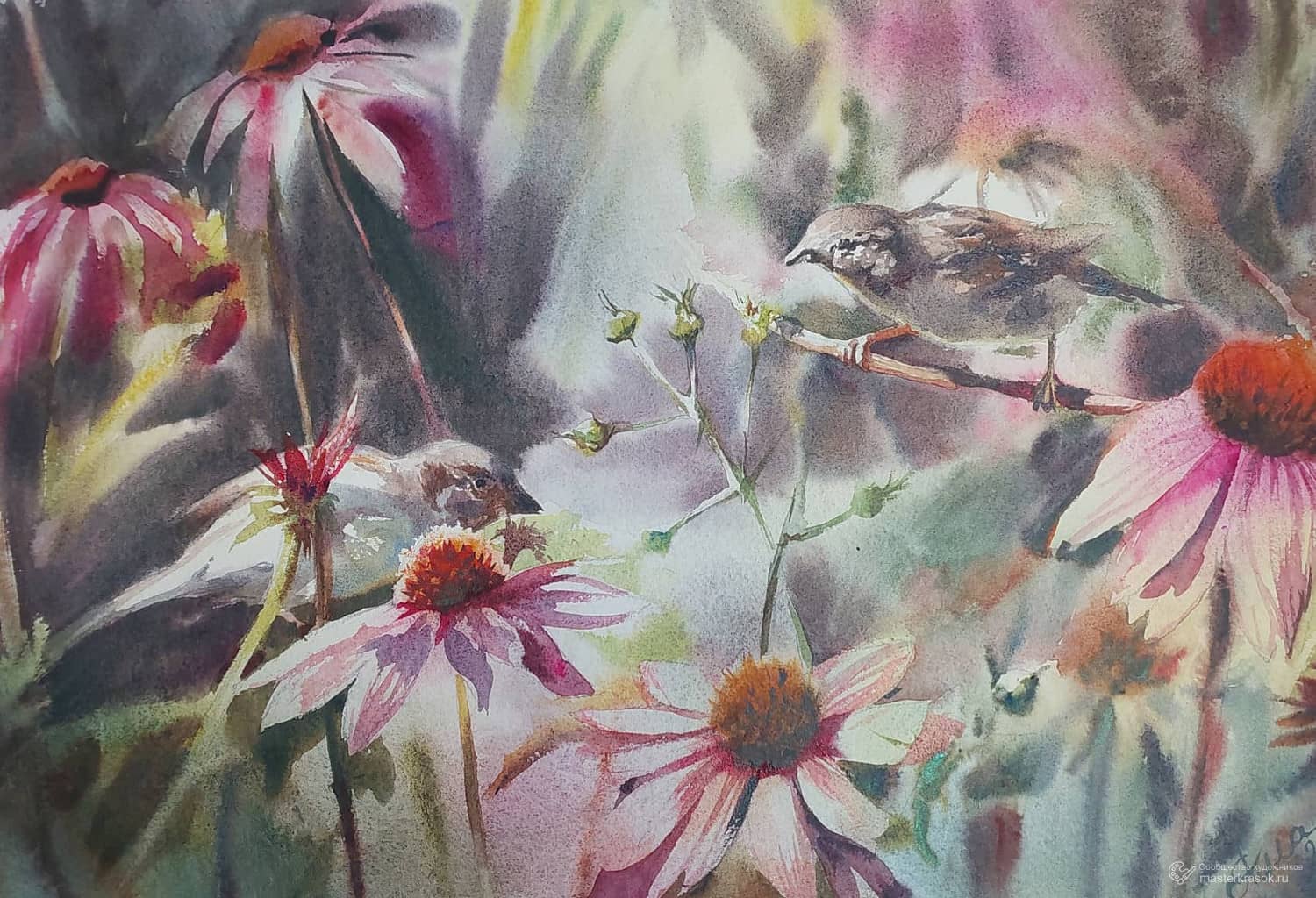 "Воробьи и эхинацея. На Манежной площади" Акварель