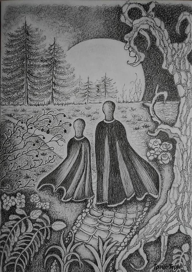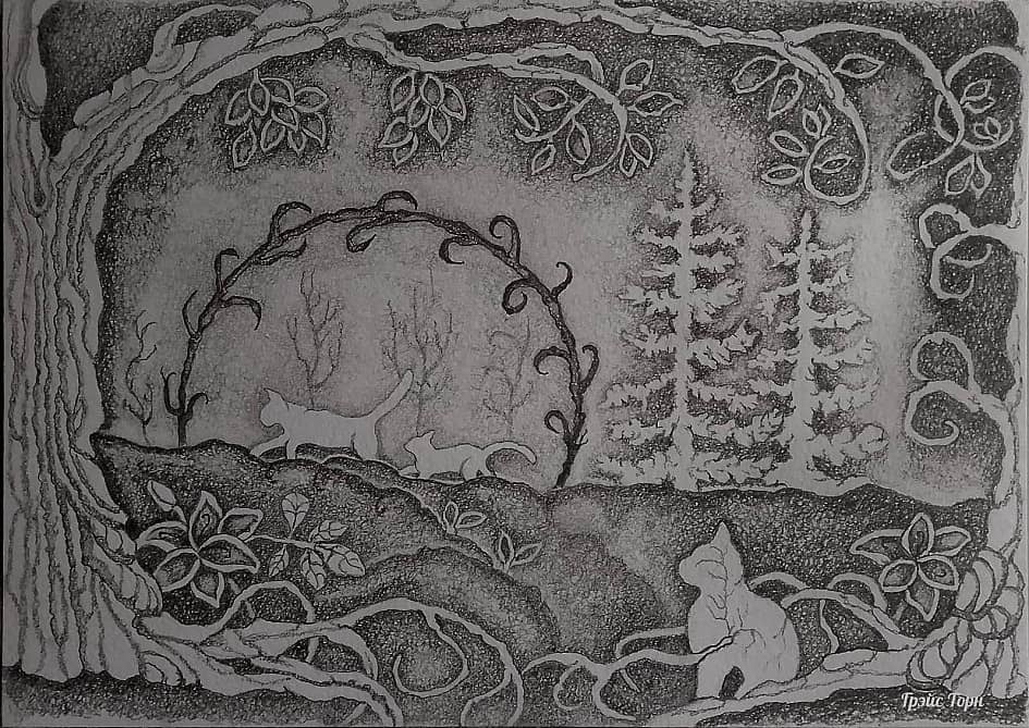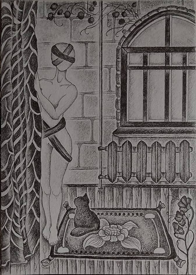 Изначально в правом углу я планировала изобразить дом, на третьем этаже которого светилось одно-единственное окно. Впоследствии передумала, но название за этой мрачной картиной так и закрепилось - Третий Этаж. 2025