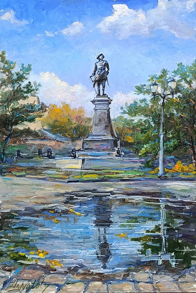 Розовый закат, отражение. Петр Первый Антокольского в Таганроге. Пленэр ZhNataly
