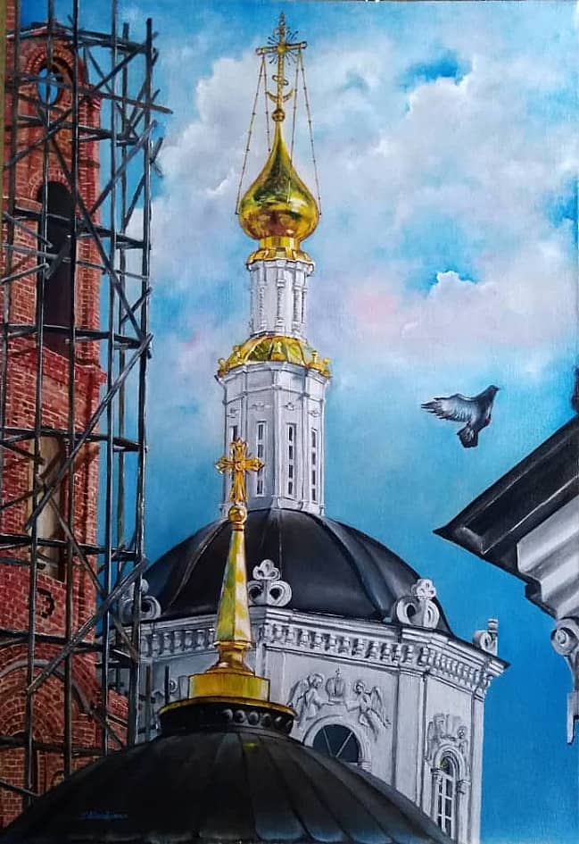 Раньше в нашем городе было много церквей. Но затем их почти все разрушили. А те, что остались, использовали, одну под хлебозавод, другую под склад, на фундаменте третьей построили кинотеатр, из четвертой сделали кукольный театр и т.д. Вот здесь, как раз, был кукольный театр. И будучи ребенком я там бывал. Только в ней тогда купола убрали и колокольню разрушили, иначе как было колокол достать. Пришло время и церкви вернули РПЦ. Восстановили купола и заново отстроили колокольню, новый колокол отлили. Что и изображено на картине. 2026