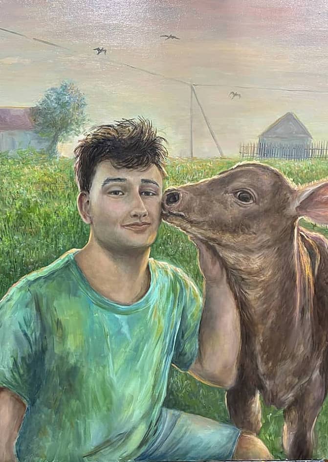 Никитина ферма Это Никита Долгов, молодой фермер из Ярославля. Позитивный молодой человек на ком земля русская дежрится.. Имеет фермерское хозяйство; коровник , телята, куры , инкубатор, козы , 11 кошек возле коровника потому что молоко есть.. Сам он ветеринар. На картине первая прогулка теленка . Теленок чувствуя доброе отношение облизал и поцеловал своего хозяина. 2025