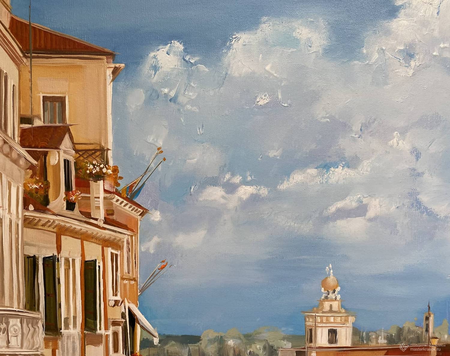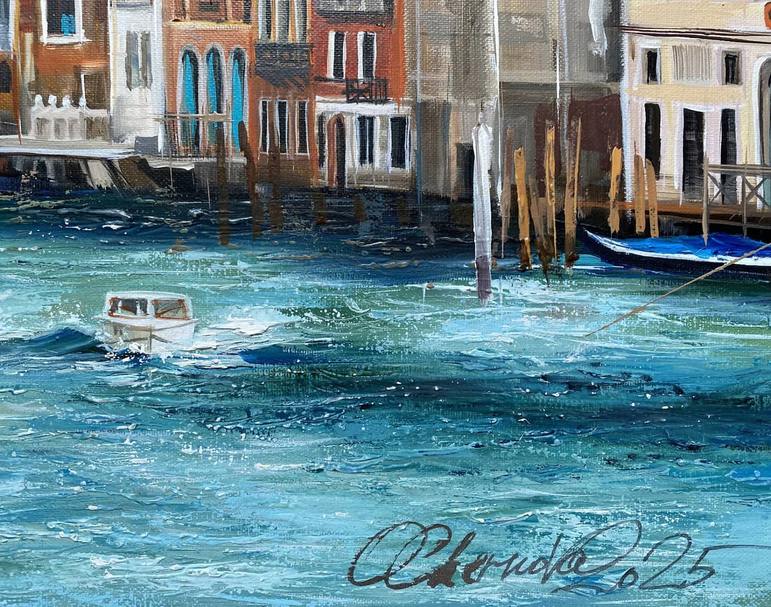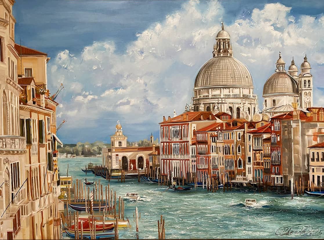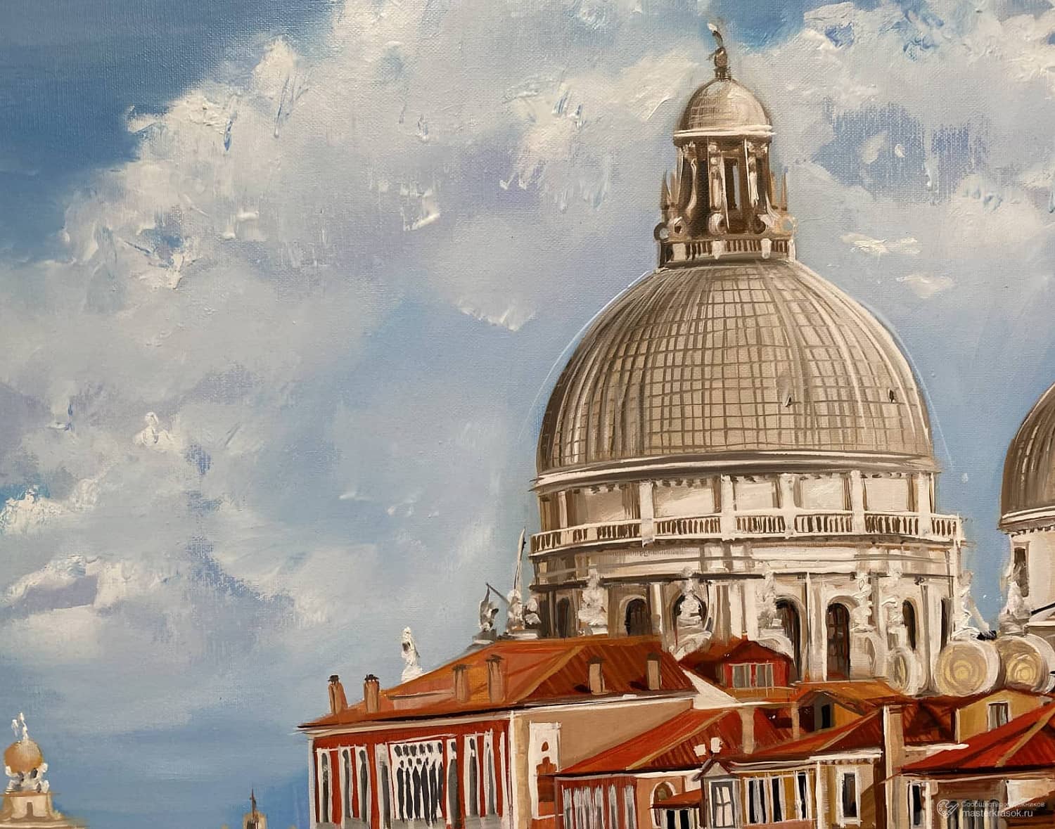 ольшая картина маслом «Венеция» 100/70 написана на заказ на холсте льняном ИонАрт. Сложная деталировка. Санта-Мария-делла-Салюте (Basilica di Santa Maria della Salute) – венецианский собор XVII века, возведенный в знак благодарности Деве Марии за избавление города от чумы, которая унесла жизни трети горожан. В память о чудесном спасении храм получил свое название – «Святая Мария Здоровья».Архитектуру храма часто относят к стилю барокко. Церковь называют базиликой, хотя её главная архитектурная особенность заключается в том, что она имеет не базиликальный план, а представляет собой редкий для Венеции образец центрического церковного здания. Оформление зданияСледует особое внимание уделить дизайнерскому решению в исполнении храма. Большой труд был вложен архитектором Baldassare Longhena и рабочими, возводившими это здание. Полное описание архитектурного ансамбля включает следующие индивидуальные особенности:здание имеет восьмигранную форму;его венцом стал купол в виде полусферы;под основным куполом разместили барабан, включающий в свой каркас 15 ребер, в которые вмонтированы окна аркообразной формы;над алтарем сегодня возвышается второй купол, сооруженный позднее;вход в храм обустроен в форме триумфальной арки;многочисленные скульптуры святых разместили на фасаде церкви;в интерьер включена аркада, состоящая из ряда колон (высотой 60м);пилястры поддерживают купол;снаружи здания по периметру обустроены ступеньки, ведущие к собору со всех сторон;пол вымощен мрамором в виде круговых орнаментов;октагон (восьмиугольная форма собор Санта Мария Делла Салюте разрез) украшают по периметру снаружи шесть капелл;статуи в виде целых композиций увенчали также центральный алтарь внутри собора Санта Мария Делла Салюте.Именно так и сегодня выглядит архитектура всего комплекса. Внутри здания находится много изображений Богородицы и картины известных мастеров живописи: Тициана, Либери, Тинторетто и Джордано. Центр алтаря украшает знаменитая икона Мадонны.Эта святыня специально была доставлена с о. Крит для водружения ее на алтаре в Санта Мария Делла Салюте Венеция.