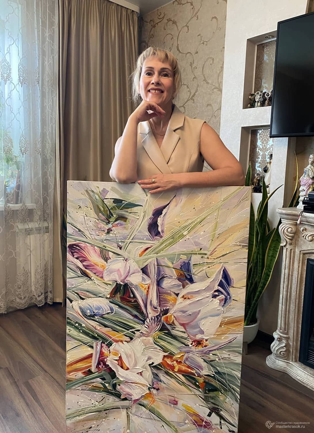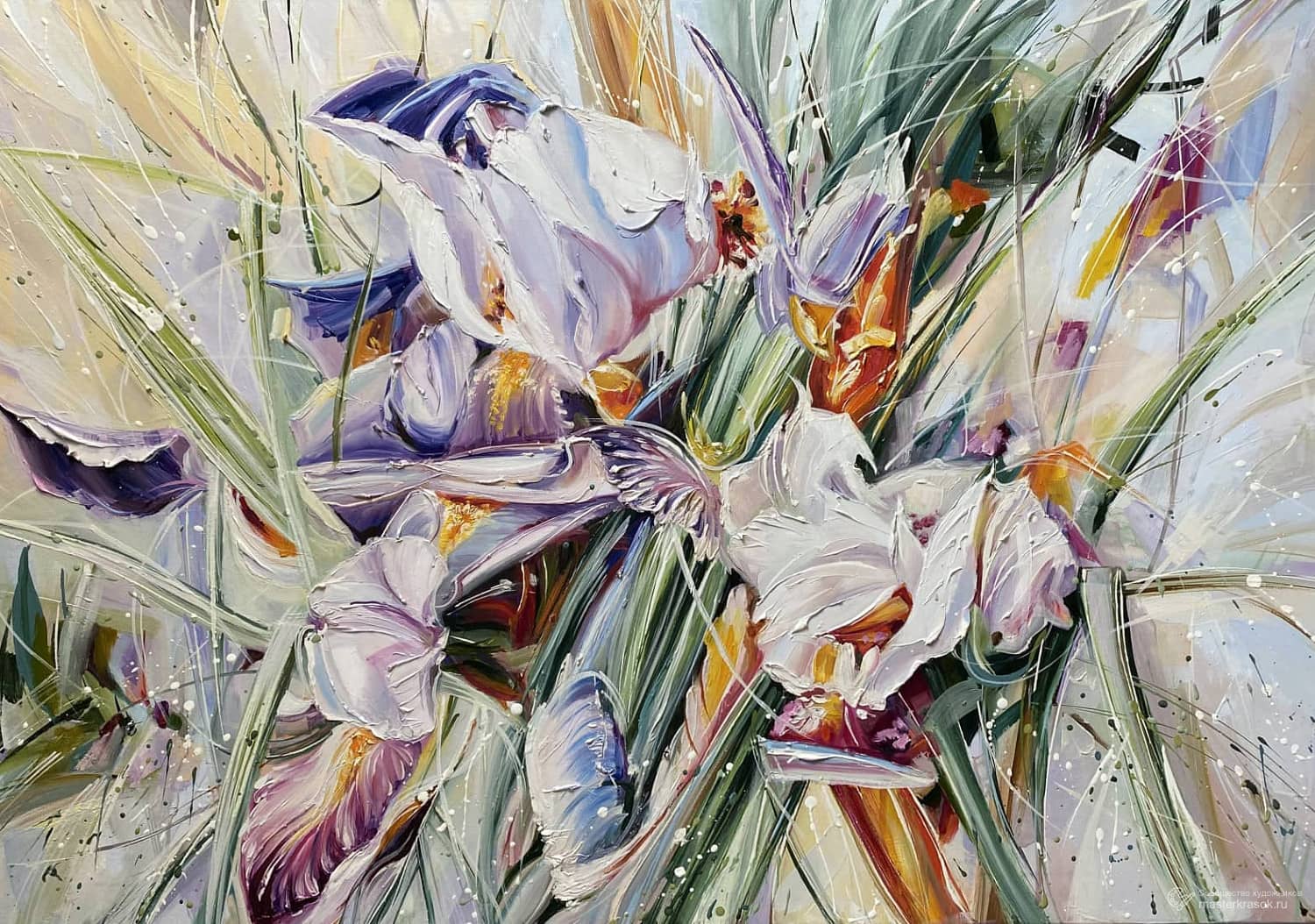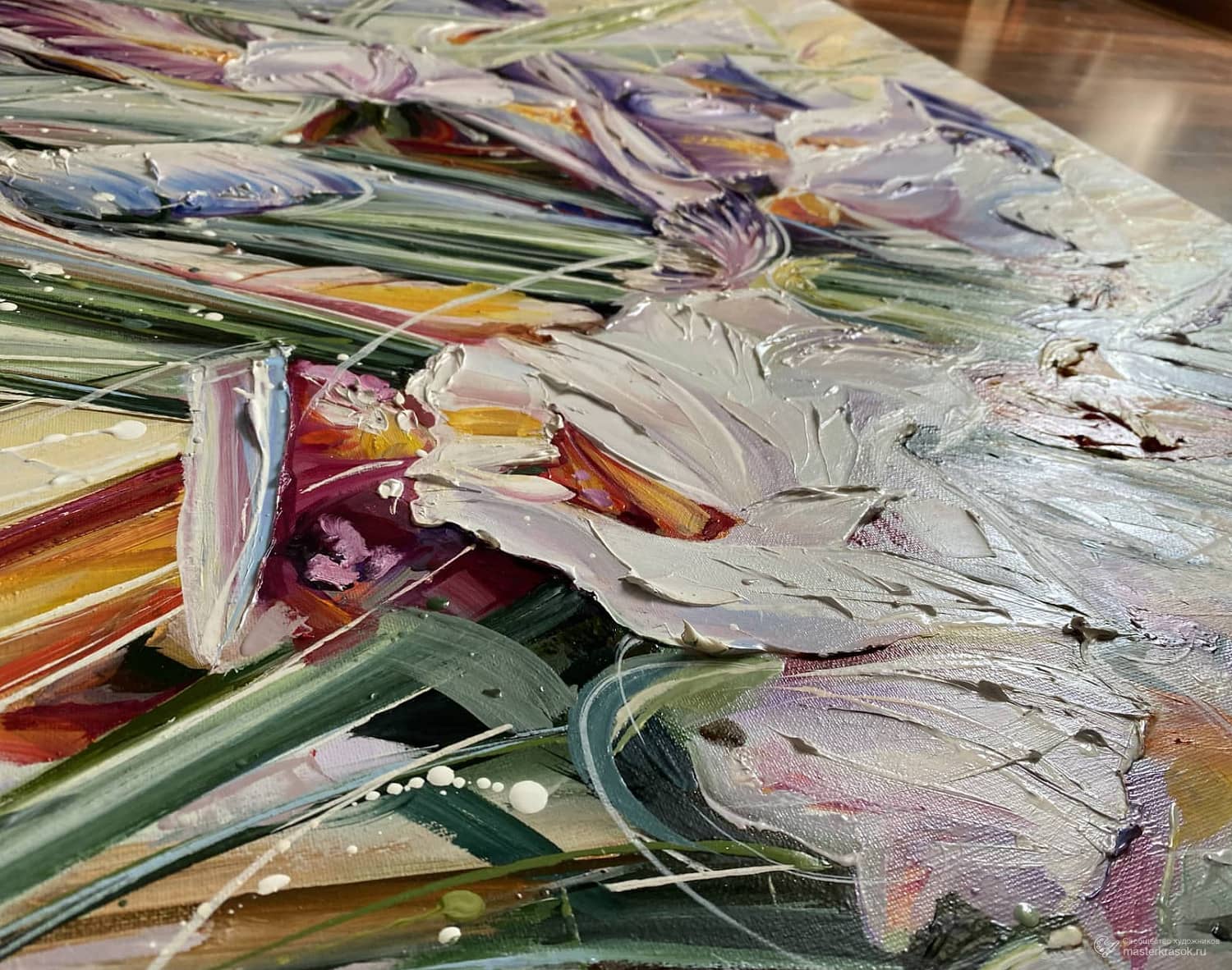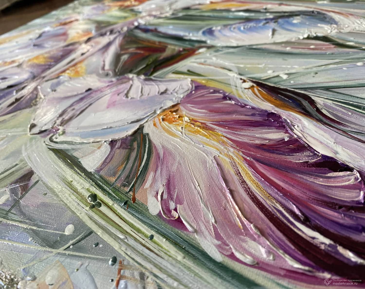 Это не просто картина, это сгусток эмоций, когда от каждого движения кисти, от каждого мазка прёт сумасшедшая энергетика! Даже если они нежные и цвета в них тихие, всё равно всегда безошибочно чувствую этот драйв! Яркая экспрессивная картина нежных ирисов, трепещущих на ветру, внесёт волнение и яркий акцент в любой интерьер. Картина написана мастихином. Позитивную энергию привлекают эти цветы. Ирисы сине-фиолетовых оттенков – это мужество, воля и успех.