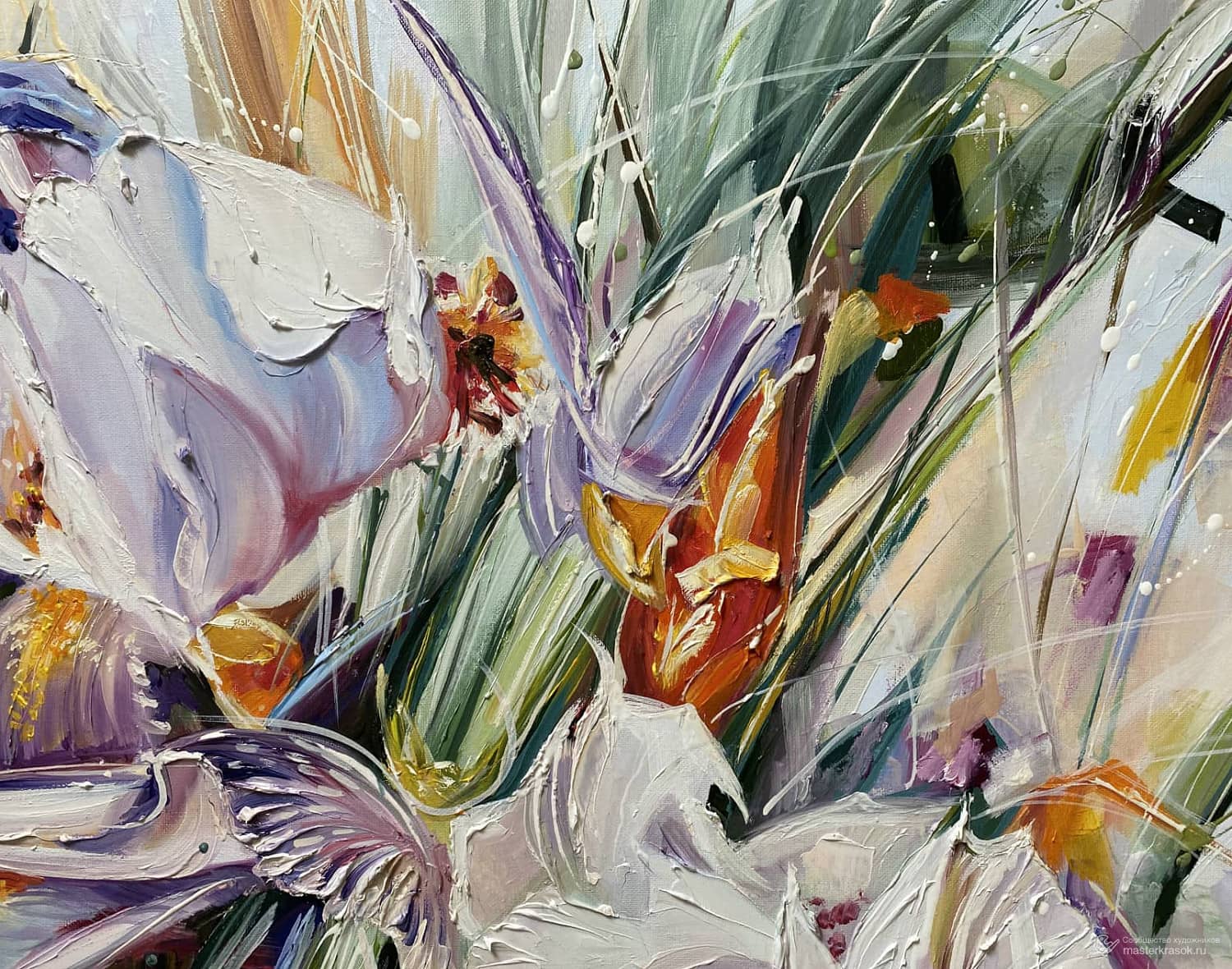 Яркая нежная картина ВОЗДУШНЫЕ ИРИСЫ 110х70см в стиле современного импрессионизма, крупные экспрессивные мазки мастихином. Нейтральная тема, цветы, удобна для подарка в любой интерьер: гостиные, спальни, залы, холлы.