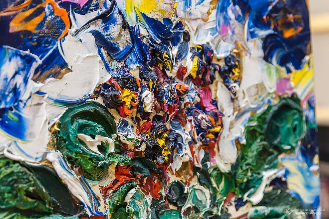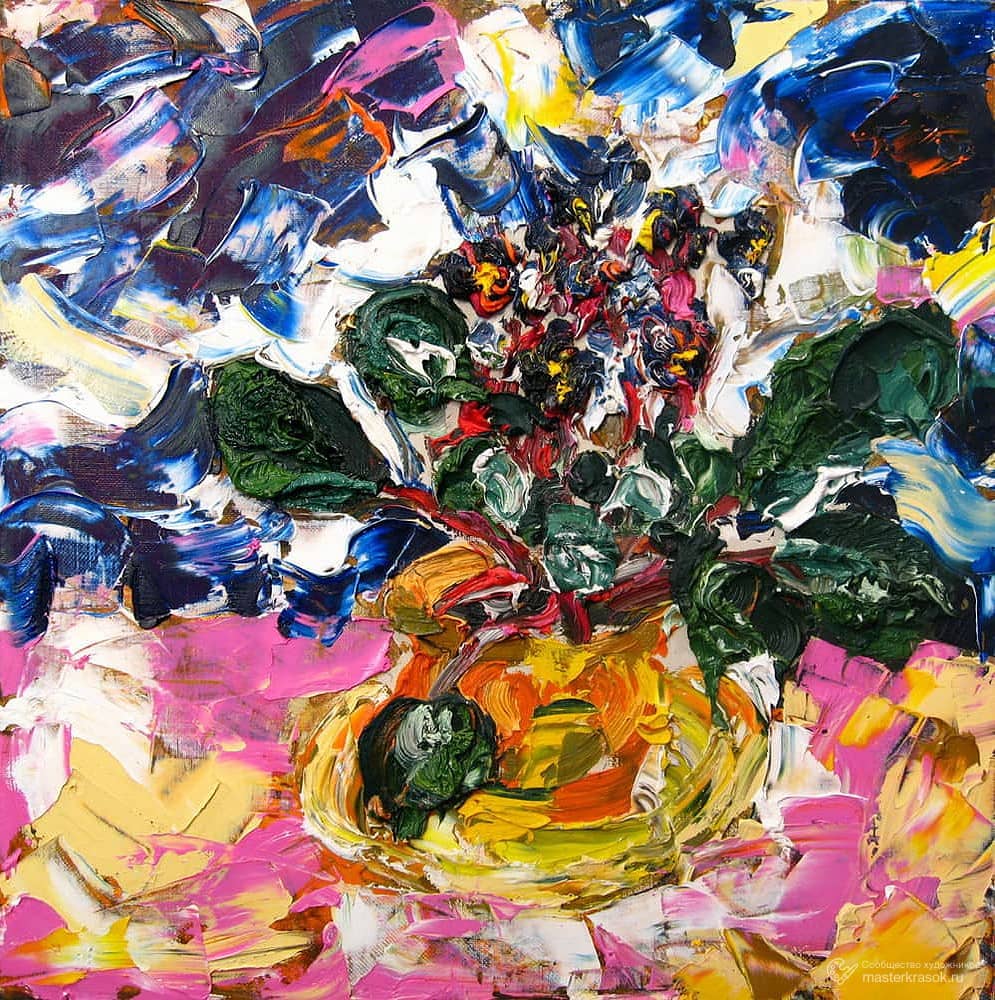 Масло, холст 60 см 60 см Когда цветок расцветает яркой вспышкой красоты, раскрывая всю мощь своей жизни в ярких красках, мы, люди, наслаждаемся его великолепием и ароматом. Нам важно почувствовать этот короткий миг существования цветка, проникнуться его душой, насытиться его свежестью и ароматом.