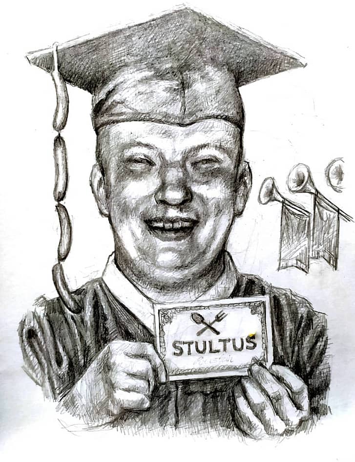 Выпускник высшего учебного поселково-хуторского заведения,южанин Еруслан,получил степень бакалейного бакалавра и торжественное одеяние: квадратную академическую шапочку,мантию и красивый диплом с запахом мяса, смеси специй и приправ.Еруслан получил свою степень исключительно из-за того,что питал свой мозг белками от яиц, жирами от свиньи и витаминами, которые из них поступали.
