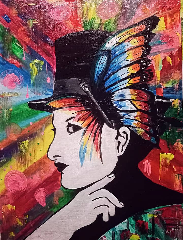Графичная строгость встречается с вихрем цвета. Это автопортрет художницы, где её творческое «Я» показано буквально: в виде фантазийной бабочки с телом-кистью, парящей на шляпе-мысли. Чёрно-белый профиль — это реальность, дисциплина, форма. А взмах крыльев бабочки и брызги краски — взрыв внутренней свободы, полёт фантазии и магия самого акта творения. Работа о двойственной природе художника: мыслителе и волшебнике в одном лице.