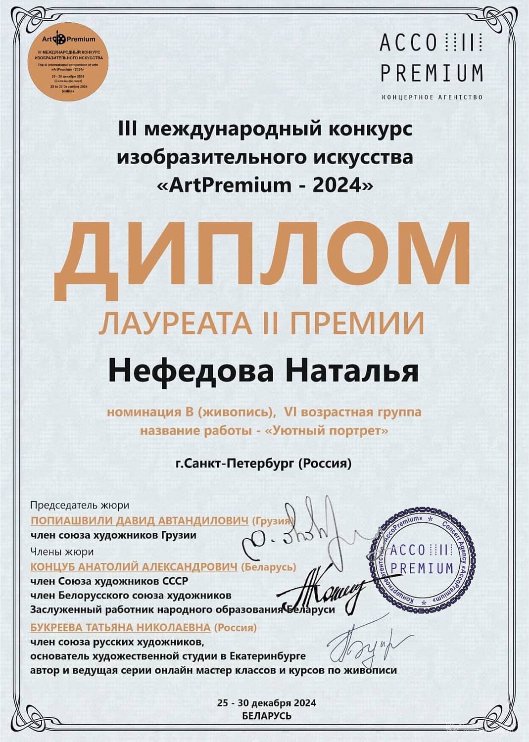 III Международный конкурс изобразительного искусства ArtPremium — 2024, лауреат II премии, в номинации «B (живопись)»