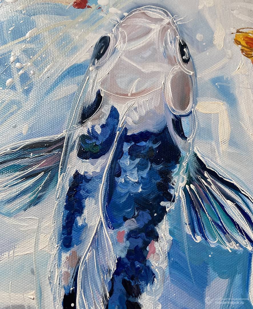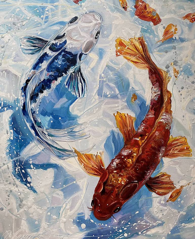 Картина маслом «Солнечные карпы» 40х50 см художник Чернова ОльгаКартина хорошо смотрится и в горизонтальной ориентации.Рыбы для меня- это про тишину, уязвимость и внутреннюю силу. Это как наше внутреннее состояние среди окружающего хаоса. Каждая рыба пример баланса.Хотела приблизиться к цвету года- белому. Написала ярких рыбок в белых водах со множеством бликов. Преломления солнечных лучей играют в плавниках и отбрасывают танцующие тени.Очень живая работа.Эти рыбки- символичная отсылка к традиционным видам росписи- Гжель и Хохлома.Если у вас есть дополнительные вопросы об этом произведении, если вы хотите увидеть больше фотографий, пожалуйста, не стесняйтесь спрашивать!Спасибо за интерес к моему творчеству!