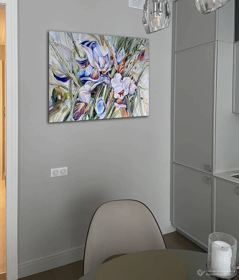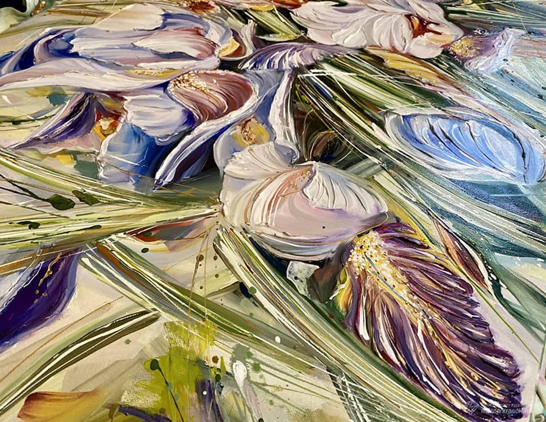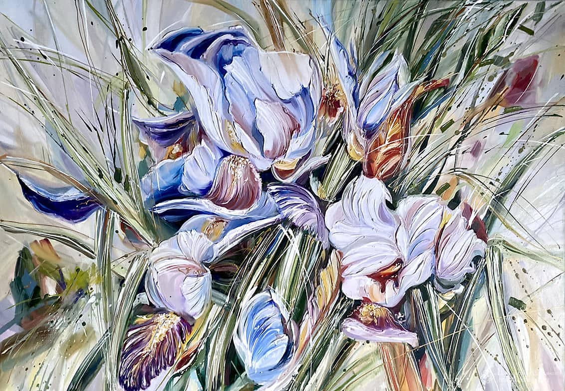 Картина маслом «Цвет ветра. Ирисы» 100х70 Холст масло кисти мастихины текстурная паста.
