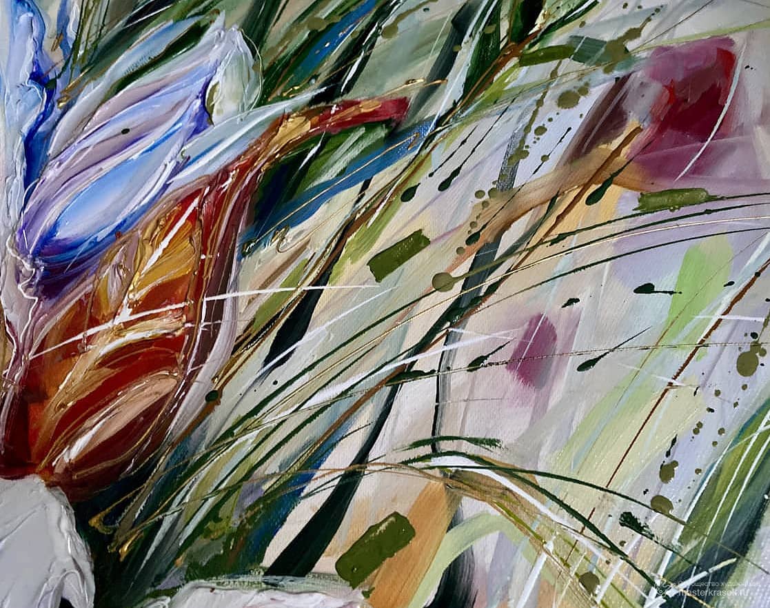 Нежные абстрактные цветы, похожие на ирисы, запутавшиеся в тонких травах, развеваются на ветру. Картина с свободным направлением.
