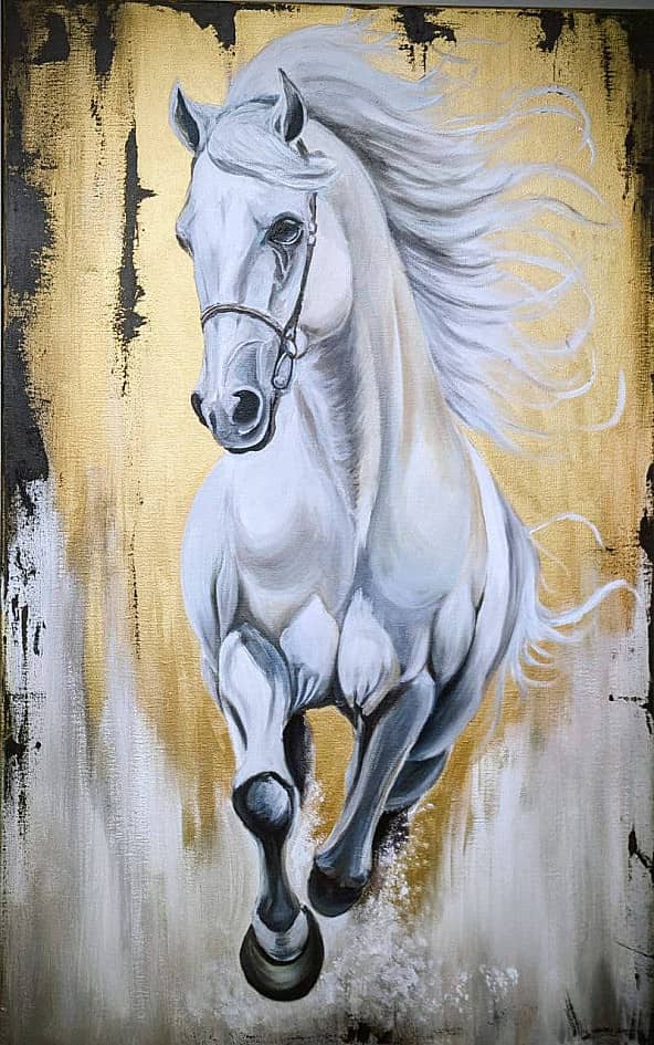 Динамичный образ белого коня, мчащегося вперёд, символизирует силу, свободу и благородство. Контраст холодных оттенков фигуры с золотым текстурным фоном подчёркивает энергию движения и придаёт работе ощущение света и роскоши. Картина станет ярким акцентом в современном интерьере.