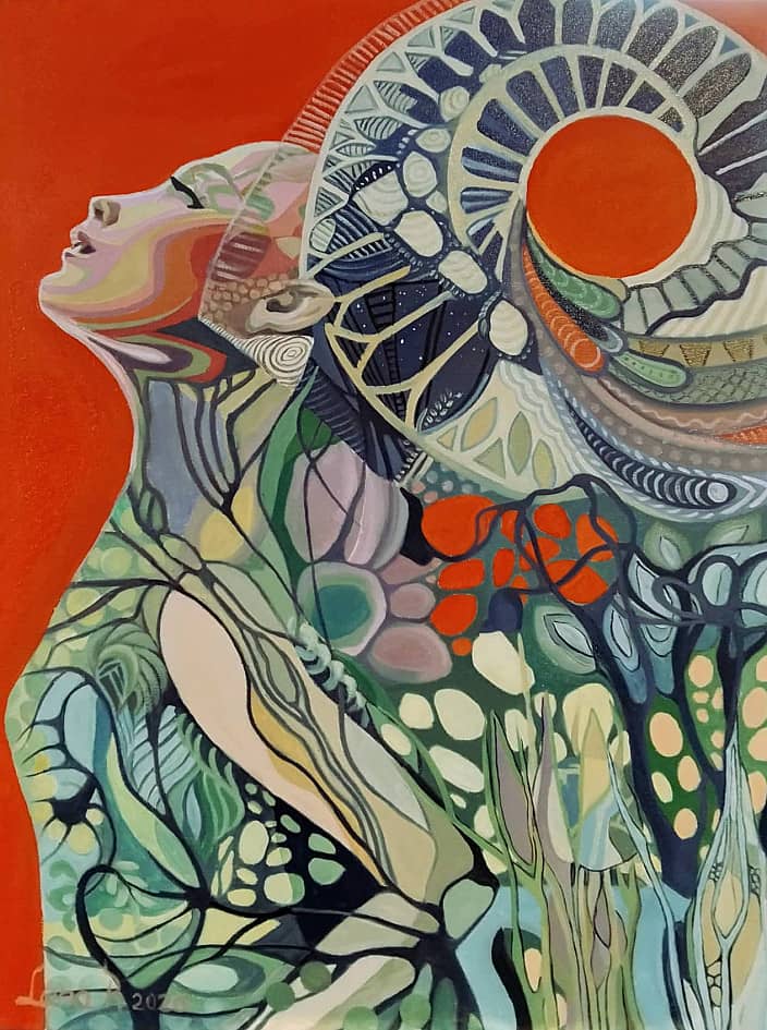 Это работа о моменте внутреннего раскрытия, когда идентичность перестает быть фиксированной формой и становится процессом. Фигура не просто смотрит вверх – она открывается. Сквозь нее проходят слои опыта, памяти, ощущений, и в какой-то момент они уже не принадлежат ей – они становятся чем больше. Круг над головой – не внешний свет, а собранный внутренний. Оно составлено из фрагментов, как память, как прожитая жизнь, которая вдруг структурируется в ясность. Это не просветление как "конец", а как состояние проводимости. Человек здесь – не центр. Она – проход.