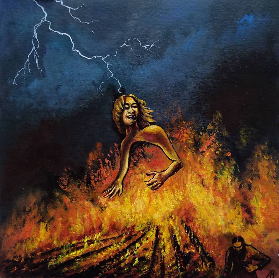 На картине разворачивается мощная и драматичная сцена сожжения ведьм. Из бушующего огня, написанного яркими мазками оранжевых, желтых и красных оттенков, возникает фигура женщины с развевающимися волосами и открытым ртом, выражающим глубокие эмоции. Над пламенем простирается грозовое небо, пронзенное ослепительной молнией, что усиливает напряжение композиции. В правом нижнем углу едва различима темная фигура, погруженная в свои думы. Произведение захватывает динамичной палитрой и экспрессивной манерой письма, передающей первобытную мощь.Картина маслом на картоне. Владимир Абаимов.Oil painting on cardboard. Vladimir Abaimov.