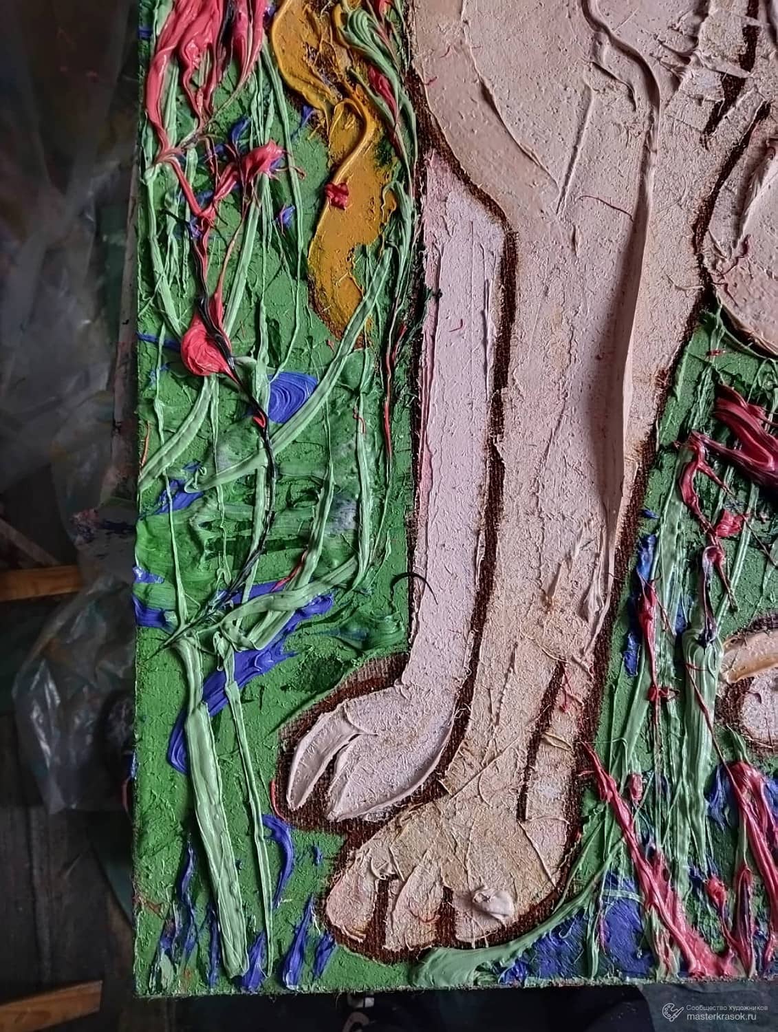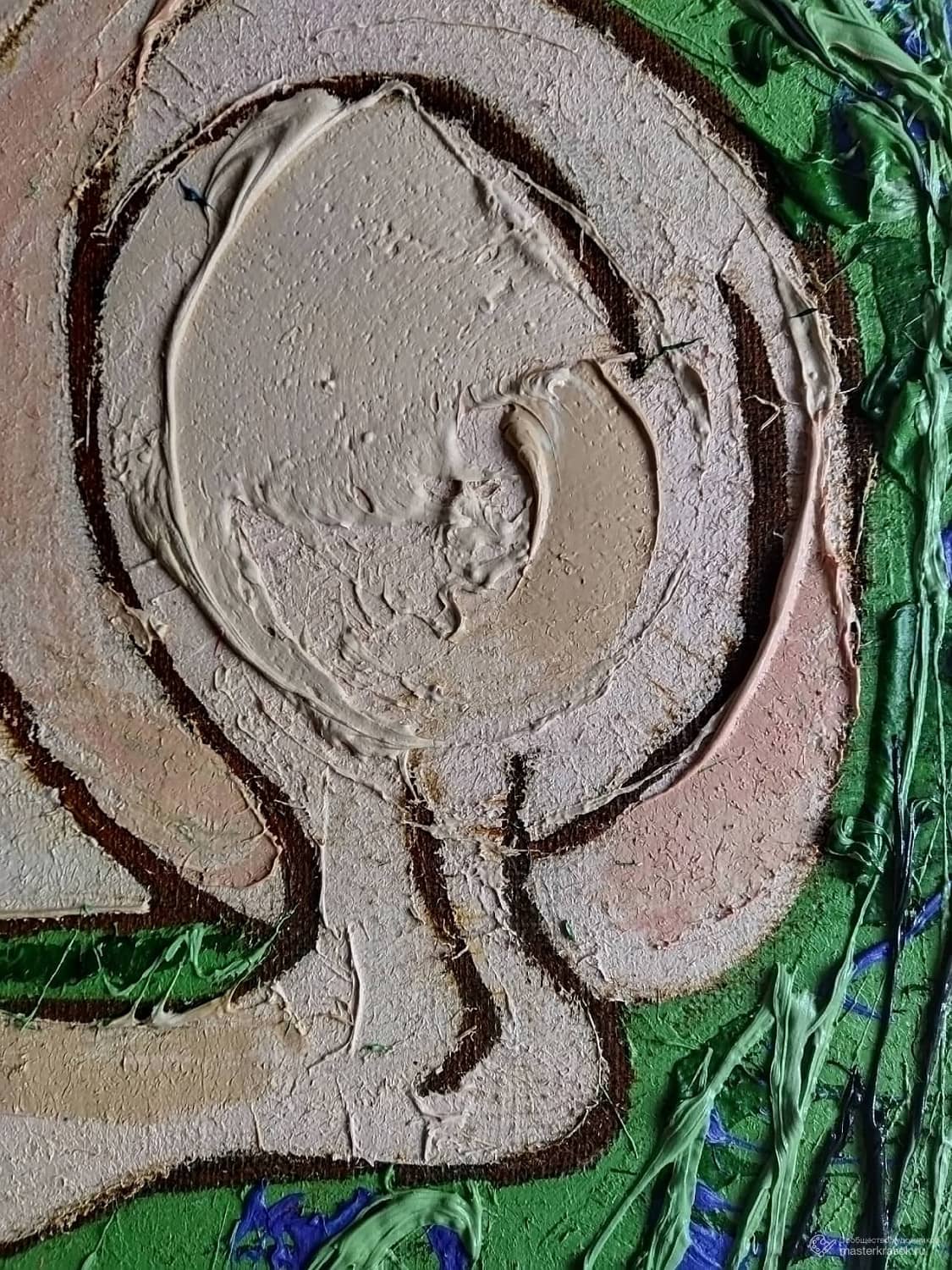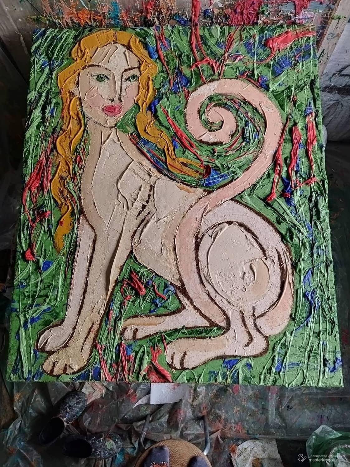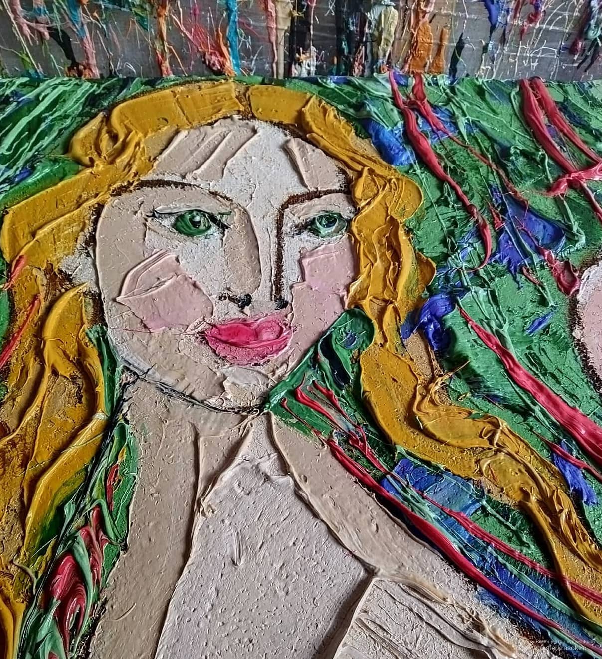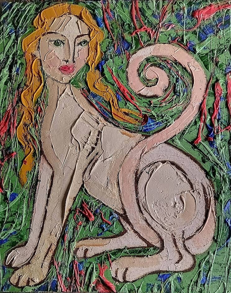 На картине «Химера в летней траве». изображено мифическое существо - гибрид животного и человека. Тело окрашено в нежно-розовый цвет и имеет выраженную рельефную фактуру. Спираль хвоста поднимается и образует крупный завиток. Фон - густая зелёная трава. Мазки краски создают яркие линии красного и синег, вызывая ощущение лета, солнечного дня и свежести трав