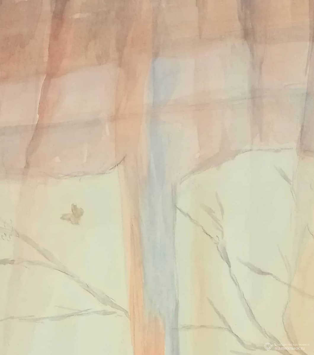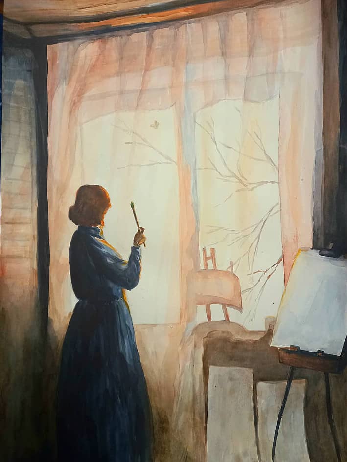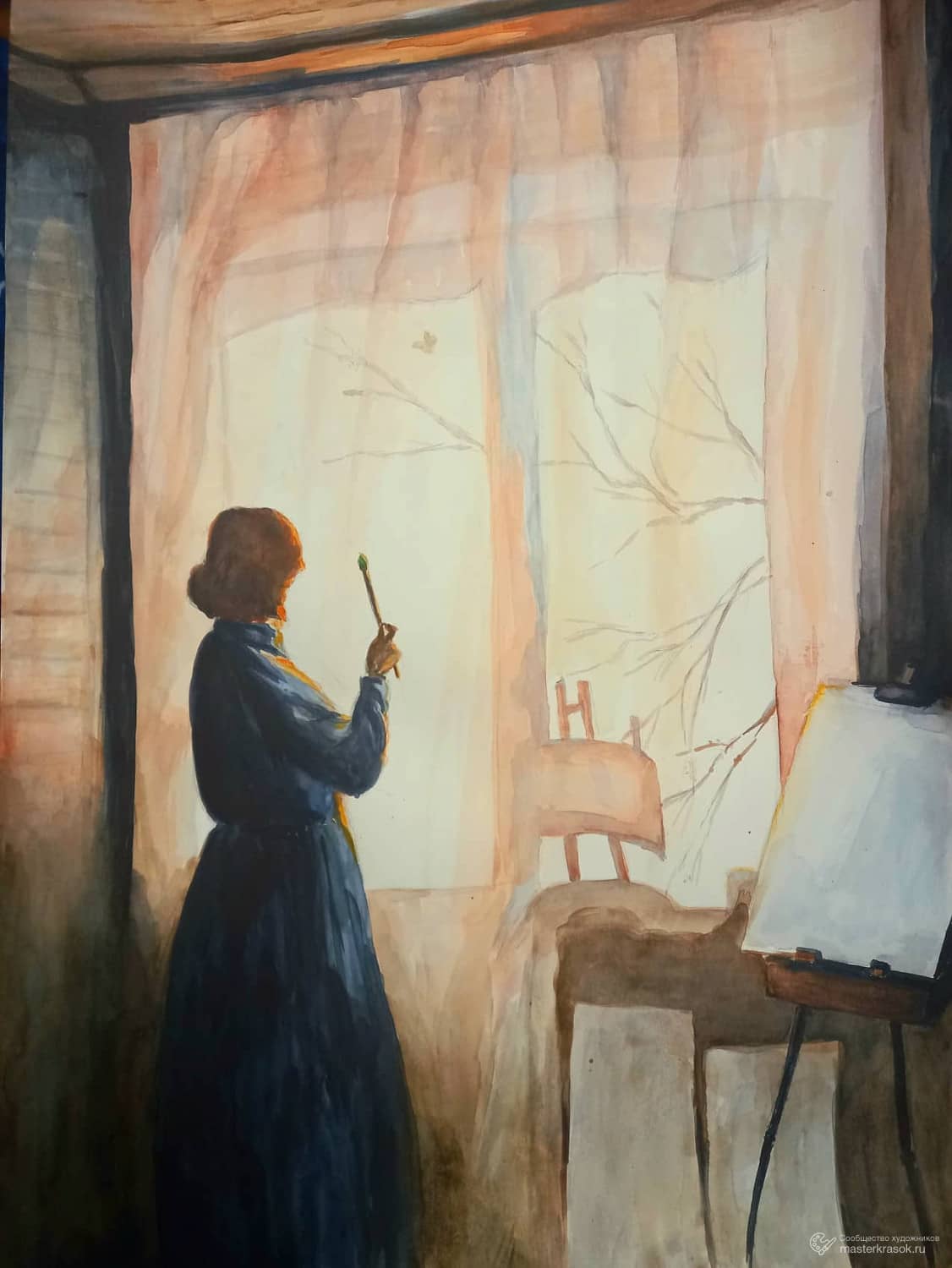 Идея картины родилась в конце марта. Активно таял снег, солнце согревало ветки калины у дома. И вдруг по занавеске промелькнула лёгкая тень - это смелая бабочка проснулась от зимней спячки и, расправив крылышки, полетела на поиски нектара. И тогда я подумала: она летит в неизвестность, туда, где ещё белеет снег и лишь там, где солнце успело растопить снежную шубку земли, несмело желтеют цветки мать-и-мачехи. Выживет ли, найдёт ли спасительную капельку нектара или замёрзнет, прервав свой полёт? Первоначально задумала написать грустящую у окна женщину и тень бабочки, как символ перемен к лучшему. Хотела в картине выразить мысль, что за зимой приходит весна, грусть обязательно сменится радостью. Но в итоге подумала, что не надо ждать счастливых перемен, ведь мы сами художники своей судьбы. Так появилась картина "Нарисую себе счастье".