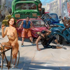 Художник, безусловно, видел фильмы, которые выпускал Жорж Мельес в начале двадцатого века. Мельес был профессиональным фокусником и на заре появления кинематографа быстро осознал, что кино может помочь ему воплотить в жизнь самые невероятные идеи. Его фильмы это фокусы, перенесенные на экран. И одним из таких фокусов была игра с масштабами.