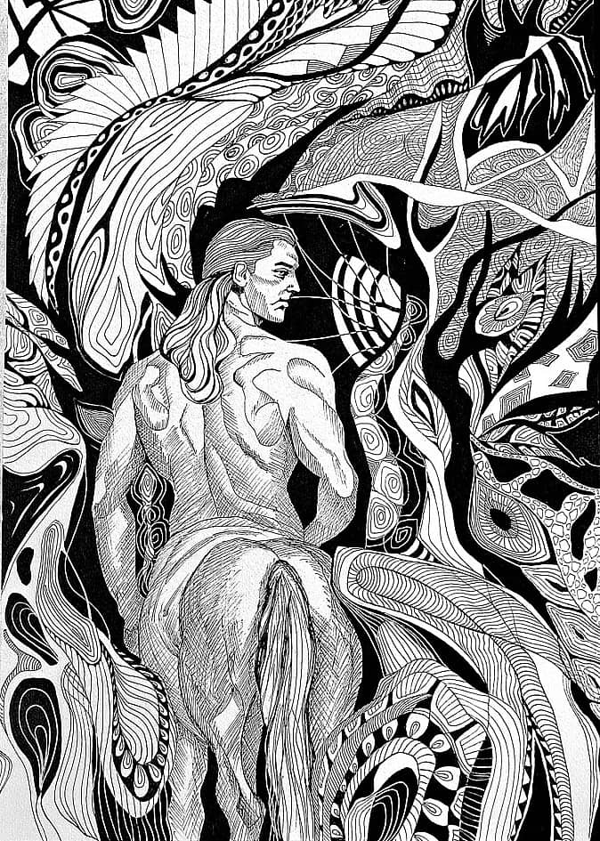 Svetlana 19 апреля 2025 в 15:23 За гранью реальности В этой черно-белой мозаике реальность переплетается с бредом — полубог, полузверь, он стоит спиной к миру, растворяющемуся в собственном сознании. 2025 Перейти