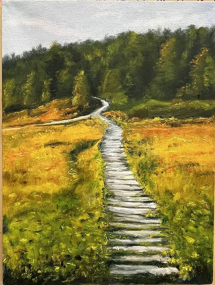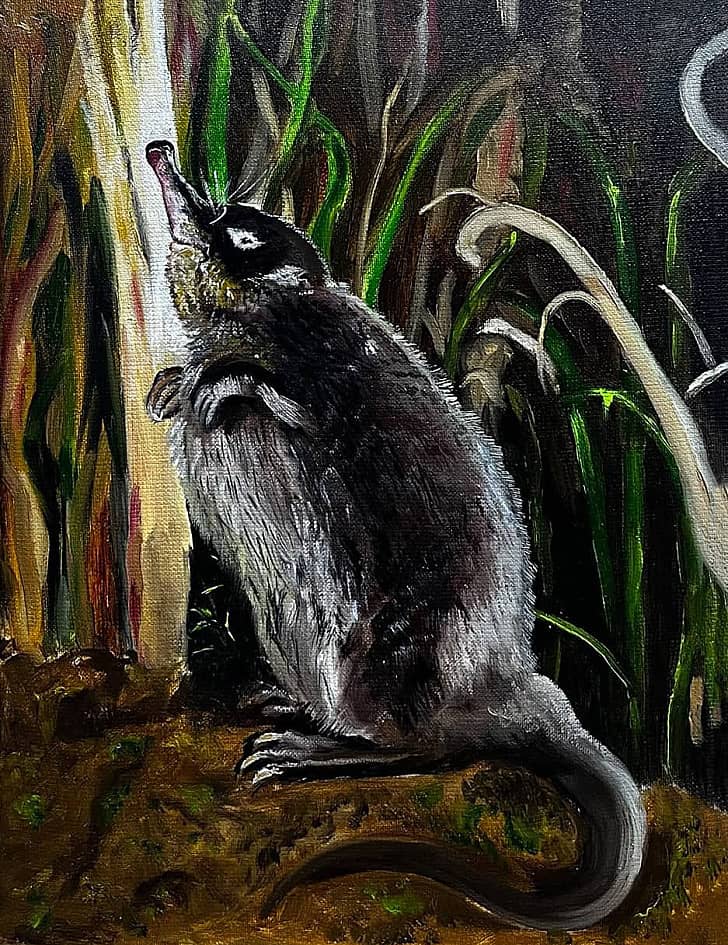 Я написала эту картину, когда преподаватель предложил выбрать животное из Красной книги. Среди тигров, журавлей и медведей мой взгляд остановился на выхухоли — маленьком, почти неизвестном существе, о котором мало кто вообще слышал. Она показалась мне удивительной — древней, немного смешной, но трогательной и очень живой.Пока писала, представляла, как она ныряет в мутную речную воду, как прячется в тине и изучает мир своим странным длинным носом. Хотелось, чтобы зритель тоже почувствовал эту тишину и нежность, которую я ощутила, когда впервые п...